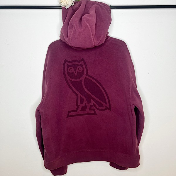 This Polartec® thermal pro microfleece hoodie features a scuba hood with adjustable cinch cord with stopper, embroidered OVO signature owl on front, embroidered Polartec® logo on right sleeve, contrast nylon kanga front pocket and debossed OVO owl graphic at back.