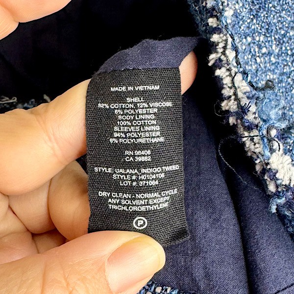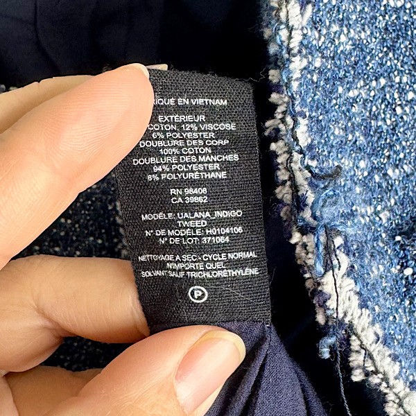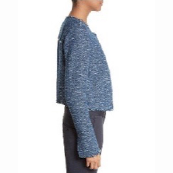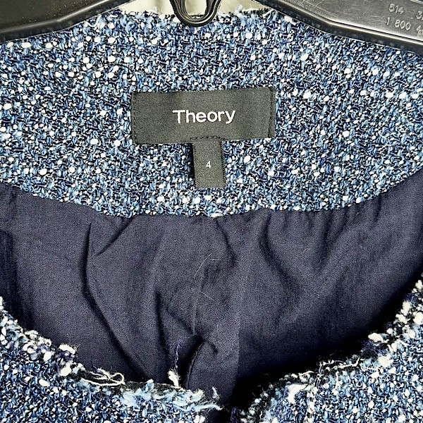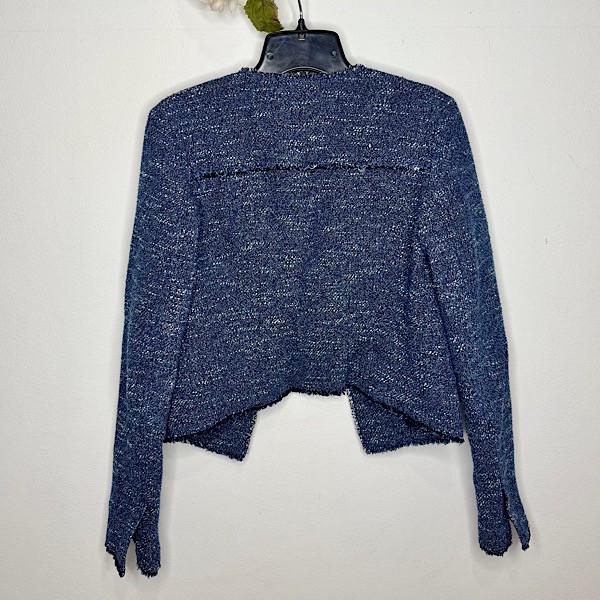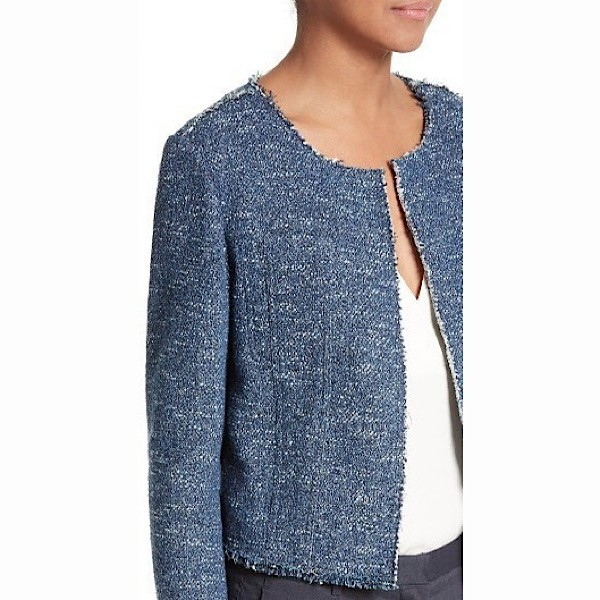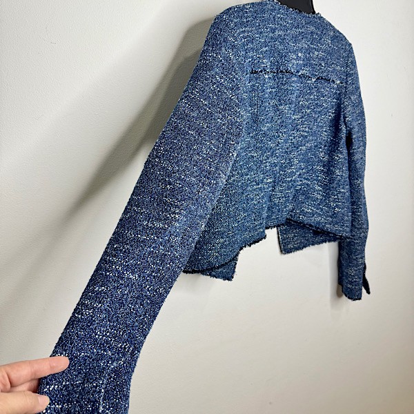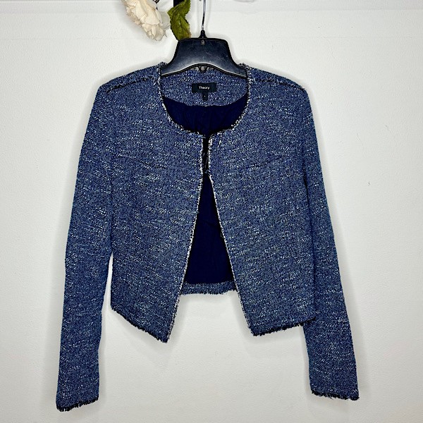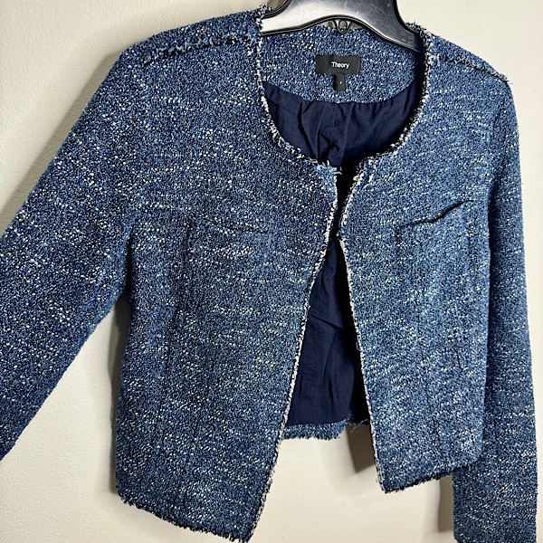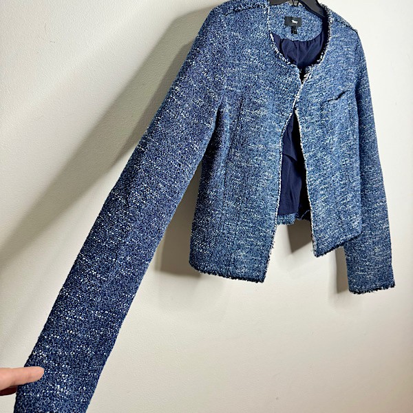 A polished tweed jacket with a modern edge, crafted in a textured blue weave. Designed with a clean collarless neckline, subtle raw-edge trim, and a streamlined silhouette, it’s the perfect layering piece to elevate both workwear and casual looks.