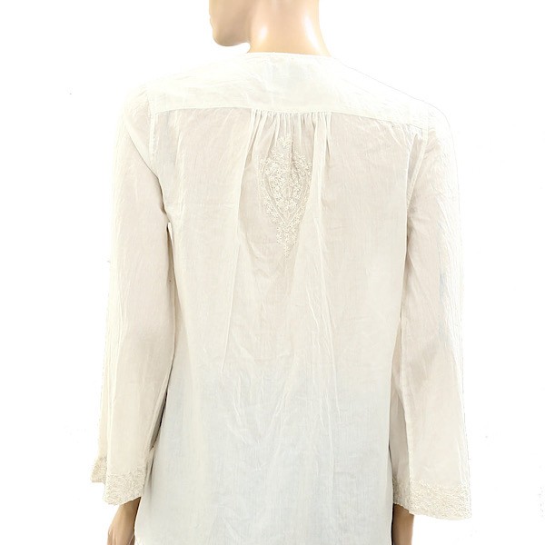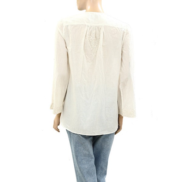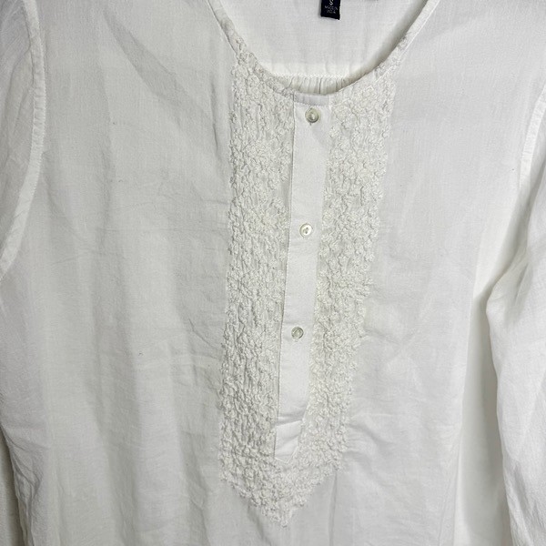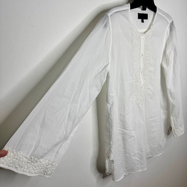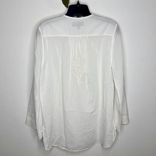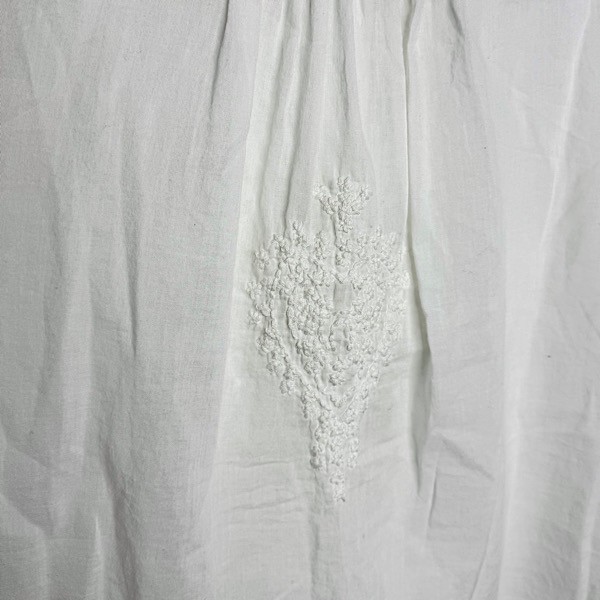 A fresh take on an everyday essential, this white cotton top features delicate floral embroidery on the front chest, sleeve cuffs, and back for a soft, feminine touch. Designed with a classic round neckline, long sleeves, and partial button detailing along the front, it blends timeless style with subtle texture.