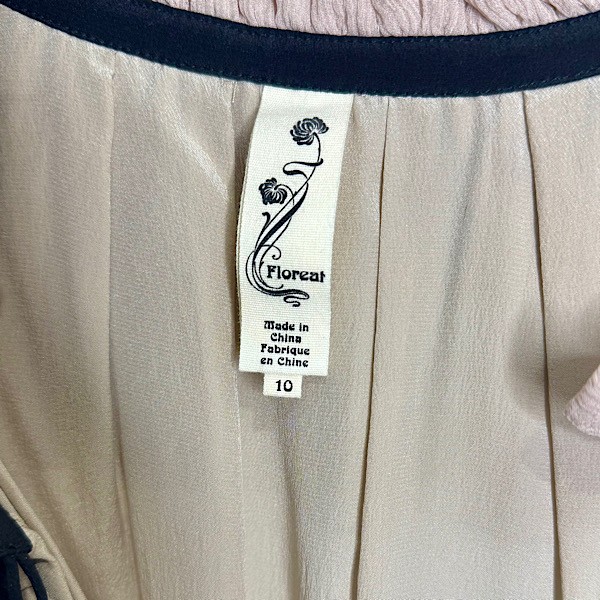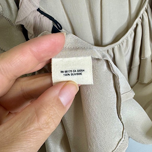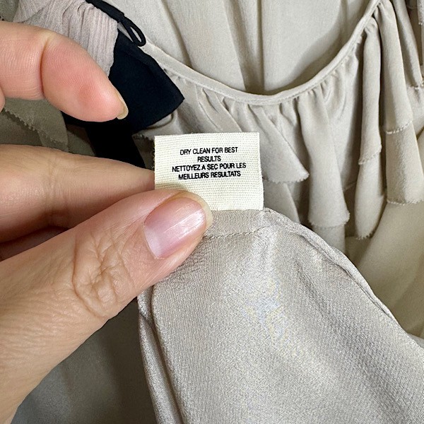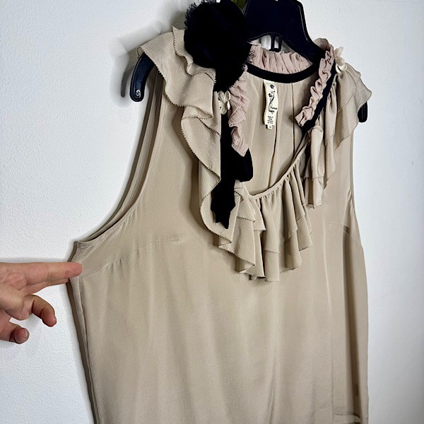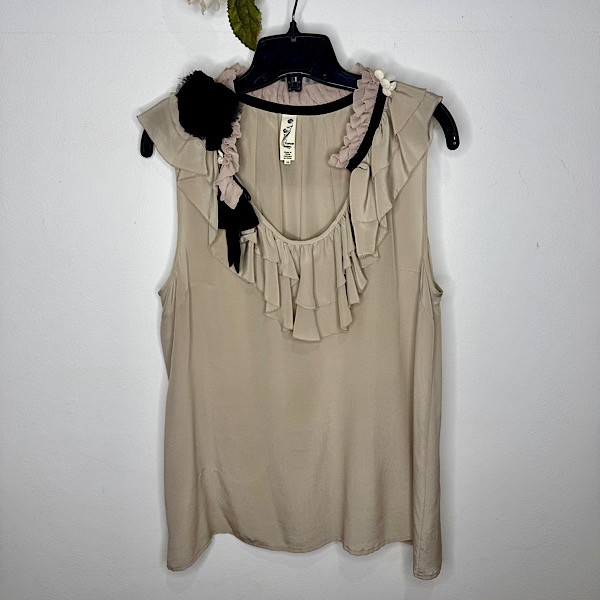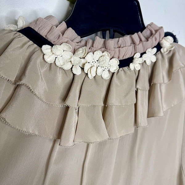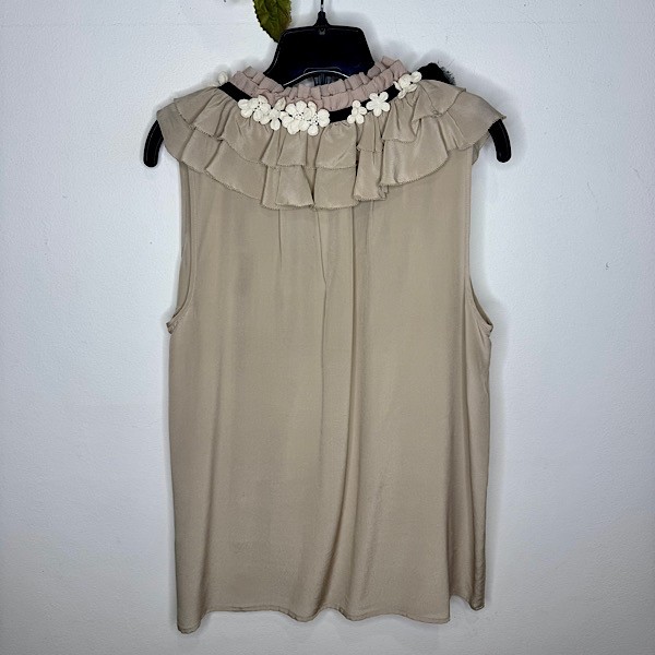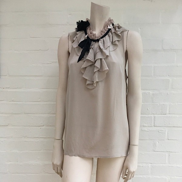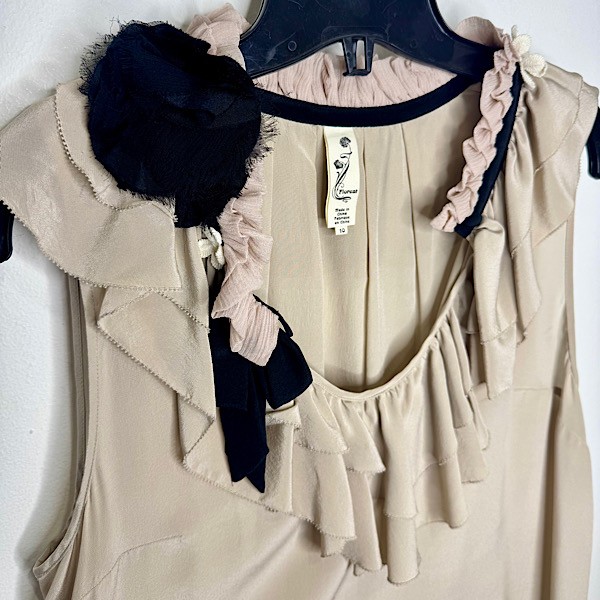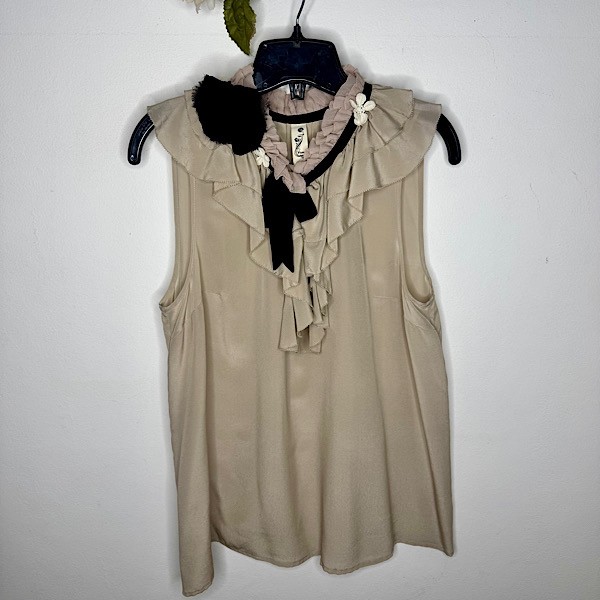 This sleeveless silk blouse brings a romantic, vintage-inspired charm to any wardrobe. Crafted in a soft neutral tone, it features cascading ruffles along the front and a beautifully detailed braided neckline adorned with floral appliqués and a contrasting velvet tie. Discreet button closure at collar creates versatility with either a open v-neckline or done up for a mock-neckline.