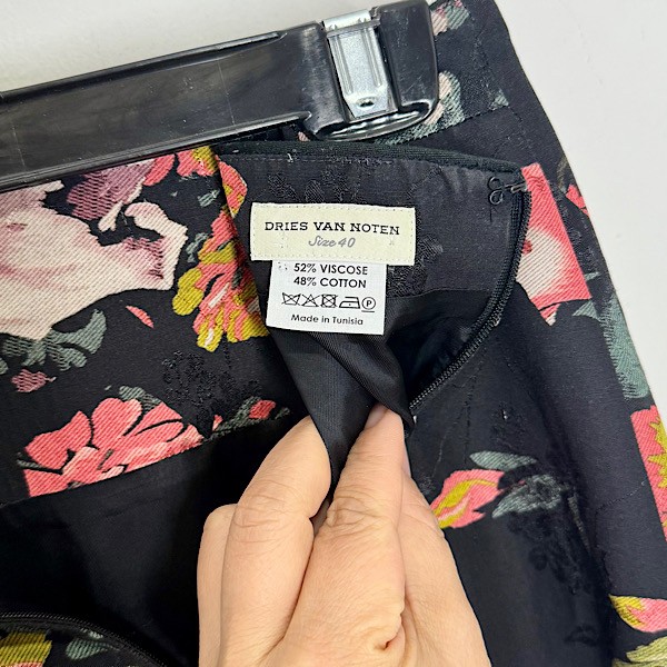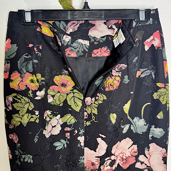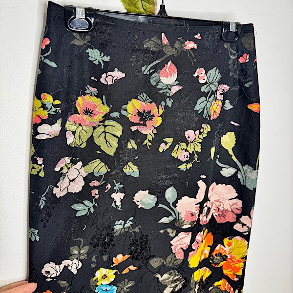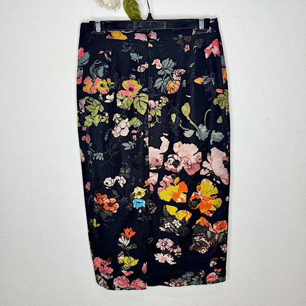 Stunning floral pencil skirt by Dries Van Noten featuring a rich, painterly print on a dark background. Classic high-waisted silhouette with a flattering, tailored fit—perfect for dressing up or styling casually. Fully lined. Hidden back zip closure.