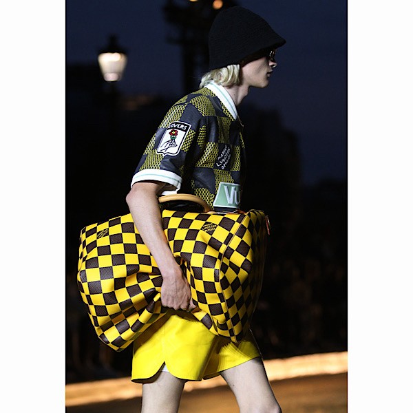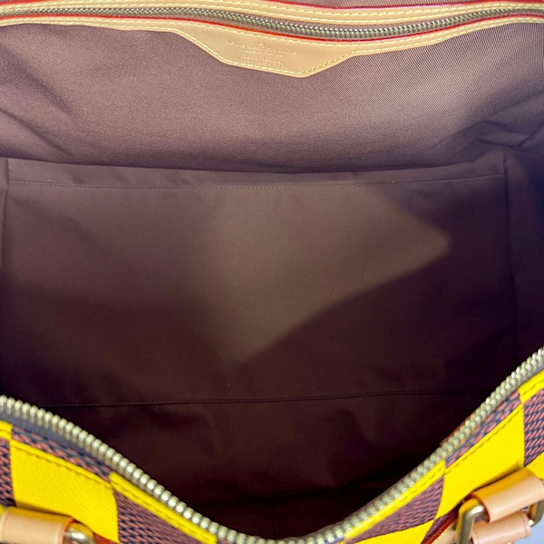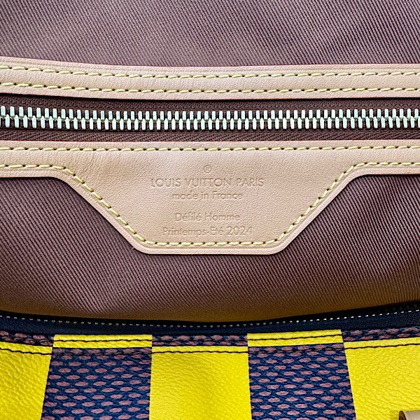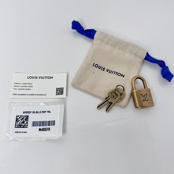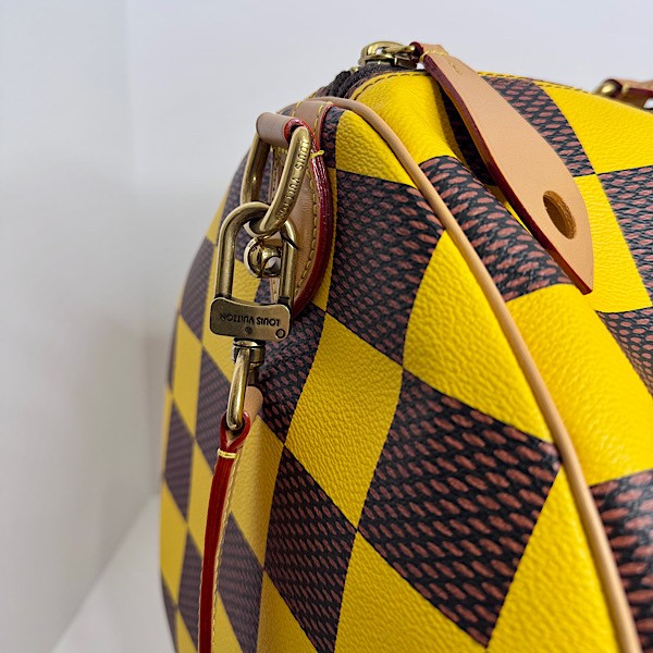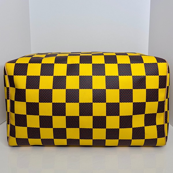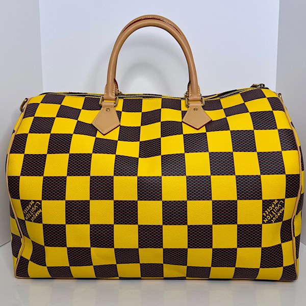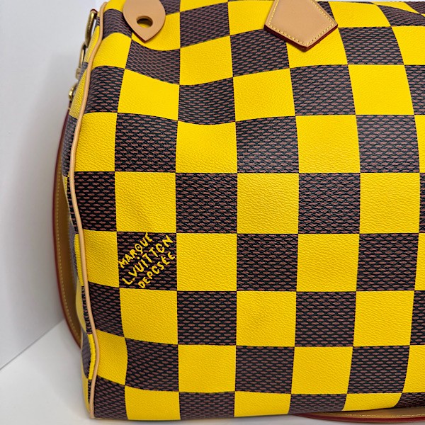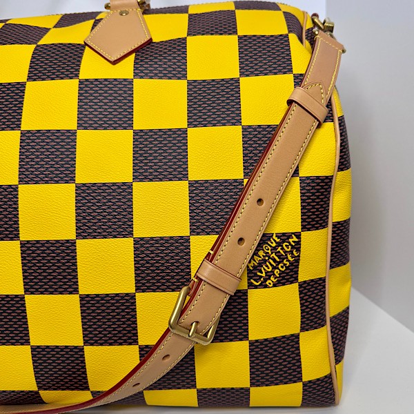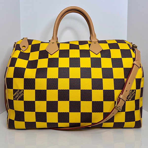 From Pharrell’s debut Spring ‘24 Men’s collection in Paris, this Speedy Bandouliere 50 is reimagined in a Damier Pop print in a bright yellow color called Jaune Mat. This stylish bag is crafted of Louis Vuitton damier coated toile canvas in cowhide leather trim. The bag has a dual leather top handles with brass hardware. The brass top zipper opens to a brown fabric interior with a 2 large patch pockets and a large zipped pocket at opposite interior walls. *this bag is now a collectors item and is now very hard to find!*
