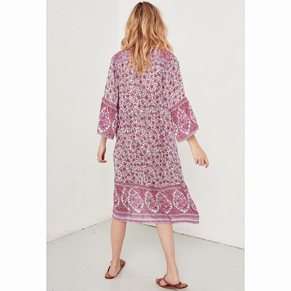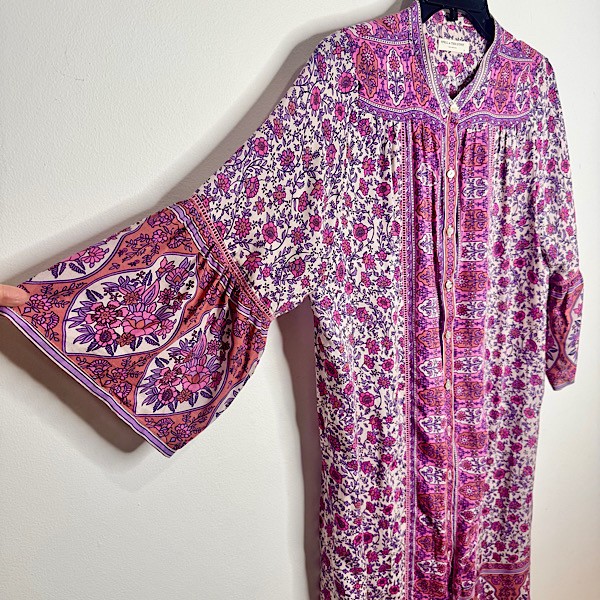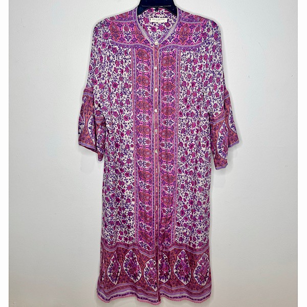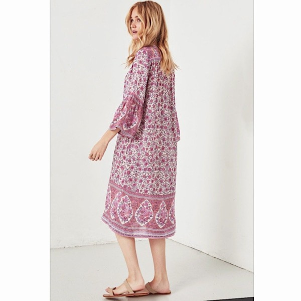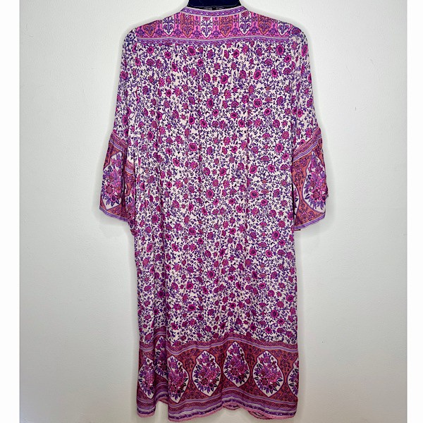 Say hello to your new weekend getup! This tunic dress is so easy to throw on with slides and go. Features a lilac, pink and peach floral motif, with 3/4 length sleeves, ladder lace detailing, lace trim at the hem, and a mother of pearl button up front.