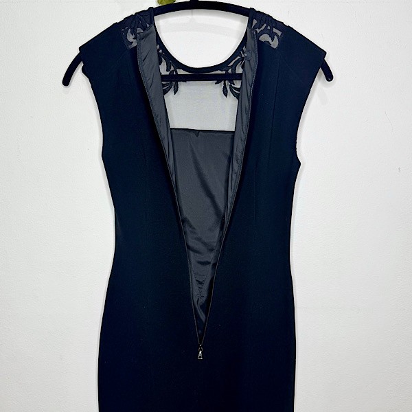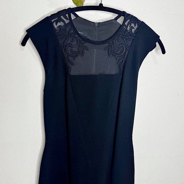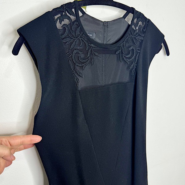 This fitted sheath dress features a sheer mesh neckline with delicate embroidered accents across the shoulders, adding a soft, feminine touch while maintaining a sleek silhouette. The cap sleeves and tailored shape create a flattering, polished look that transitions effortlessly from evening events to special occasions.