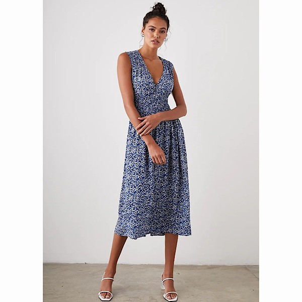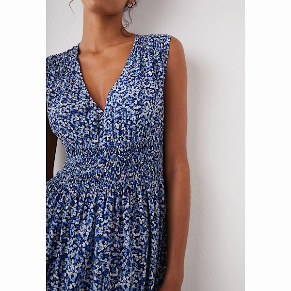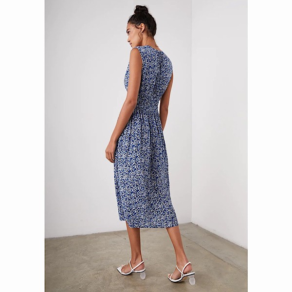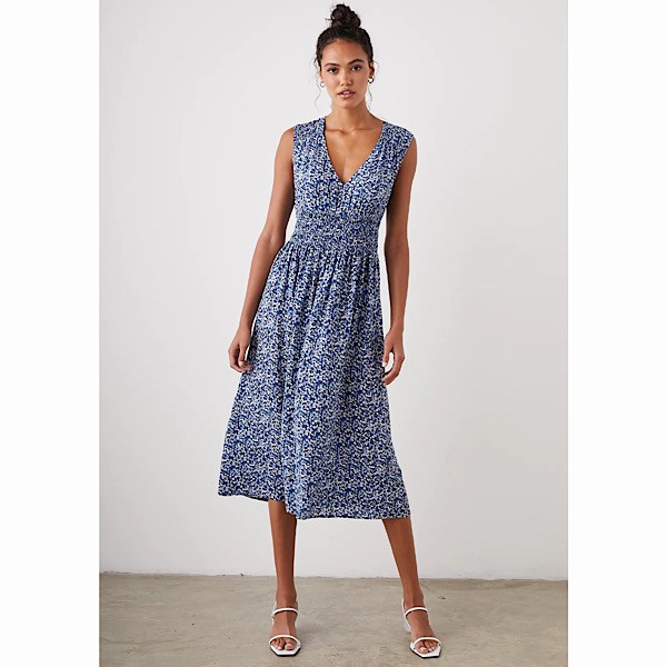 This pretty and effortless dress is a must-have for any wardrobe. Crafted from a lightweight blend of rayon and viscose, the Izzy Dress flatters in all the right places, with smocking at the waist for definition. Its mid-calf drape and moody blue floral print elevate your look with sophistication and style.