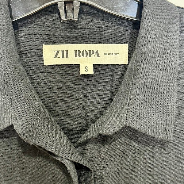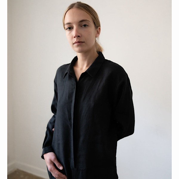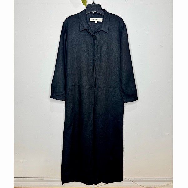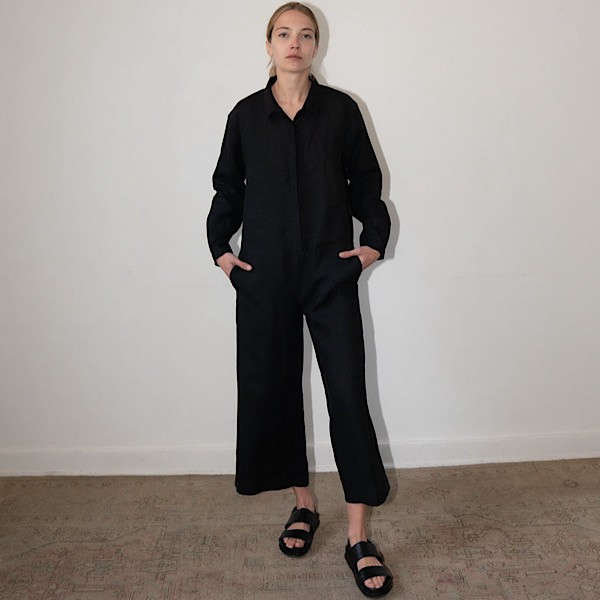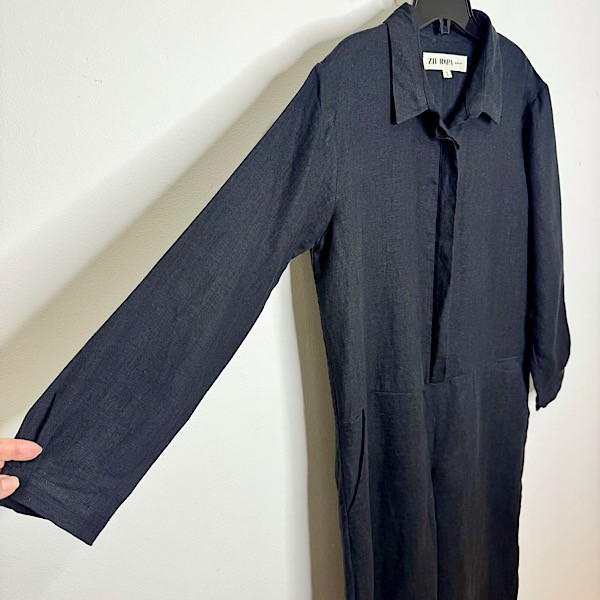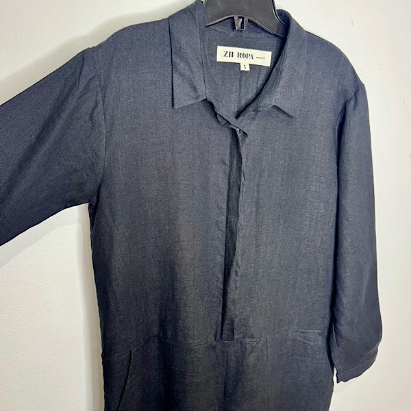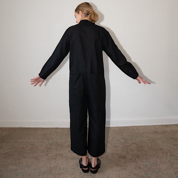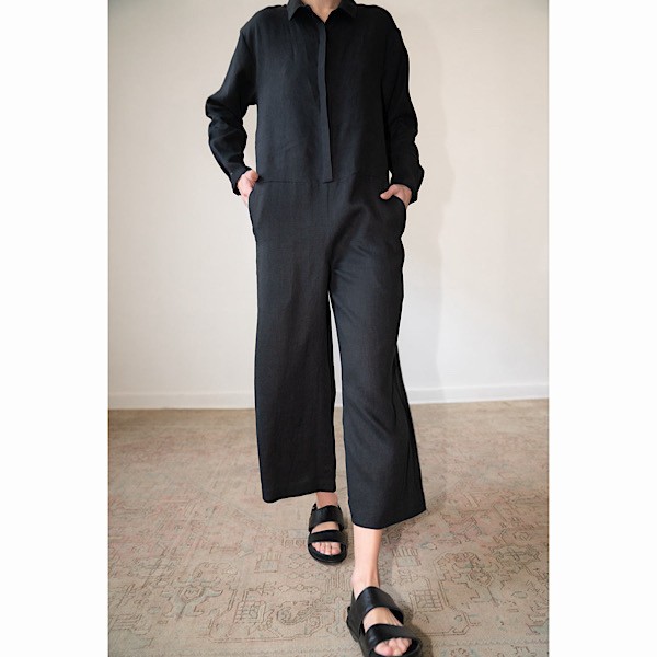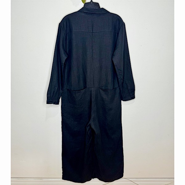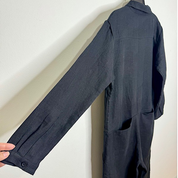 This is an essential workwear jumpsuit. Features long button cuffed long sleeves, button front closures with hidden placket, point collar, deep slanted front pockets and welt pockets at back.