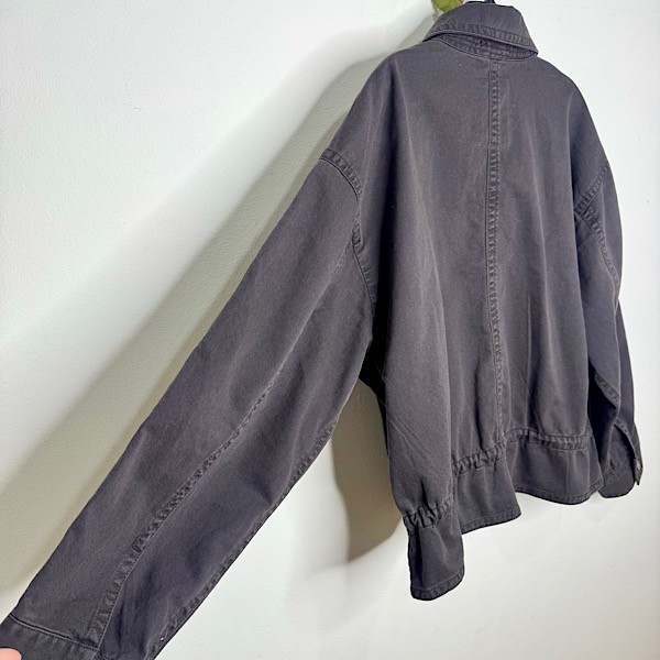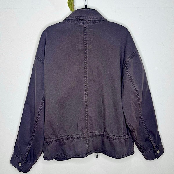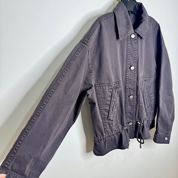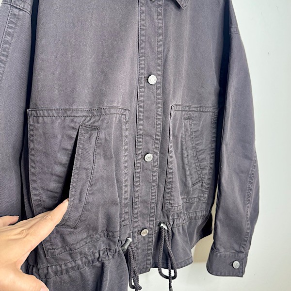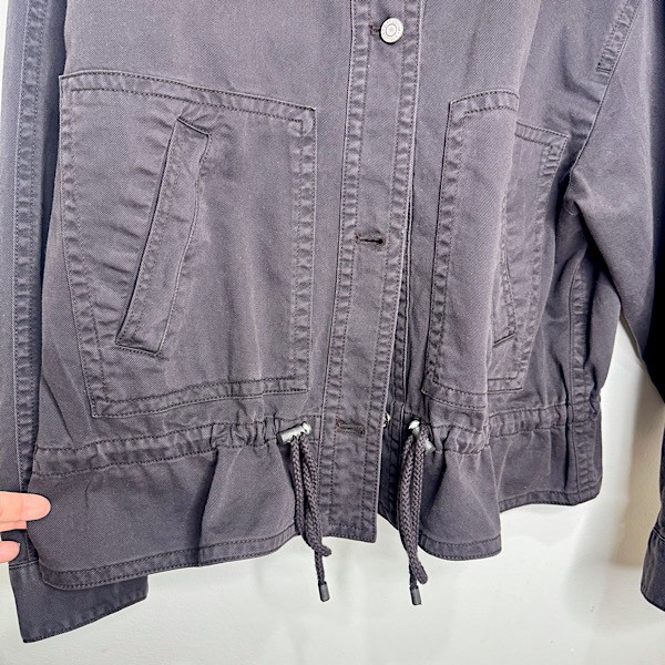 A soft cotton twill utility jacket in classic black, designed with a slightly cropped silhouette for a modern edge. Finished with a point collar, button-front closure, long sleeves, and adjustable drawcords at the hem for a customizable fit.