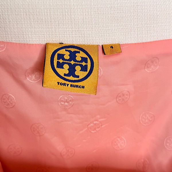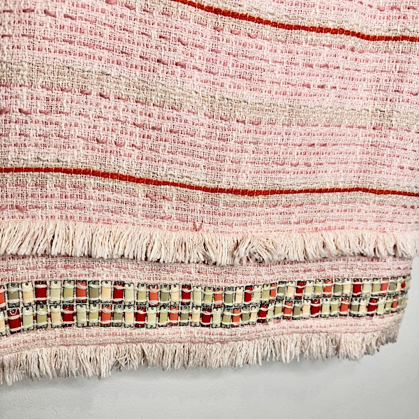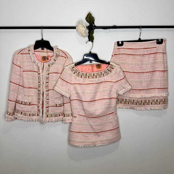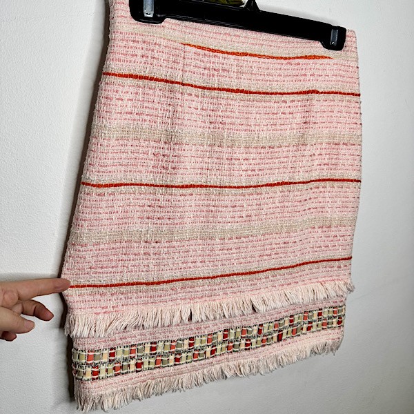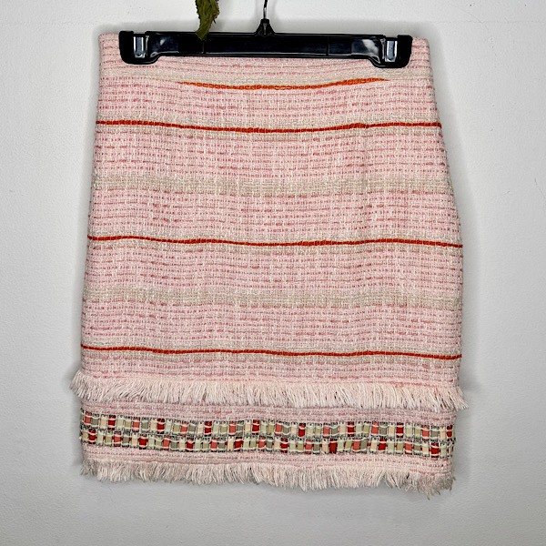 A chic Tory Burch tweed skirt in soft blush tones, woven with subtle stripes and textured detail. Finished with a fringed hem and decorative trim, this polished mini blends classic tailoring with modern femininity. Side zip closure, fully lined interior.