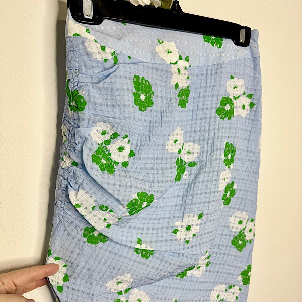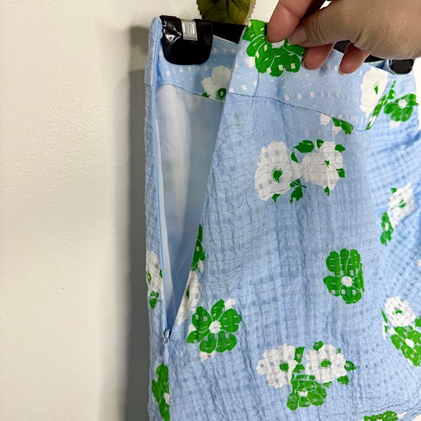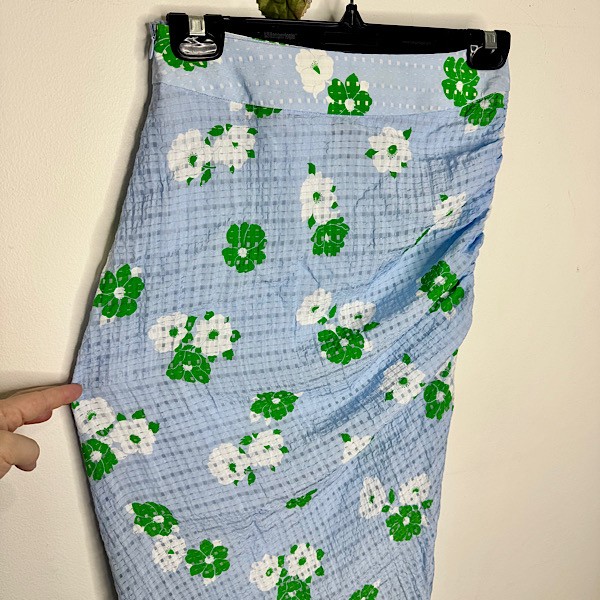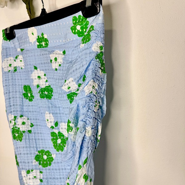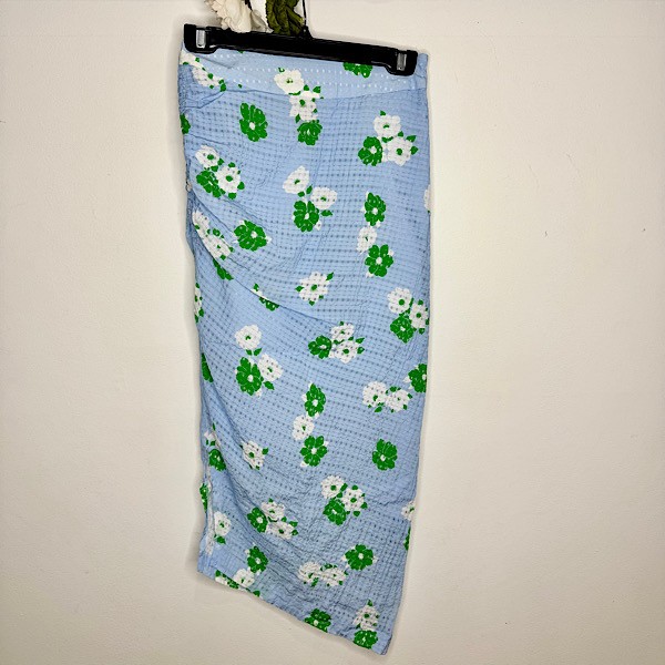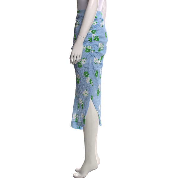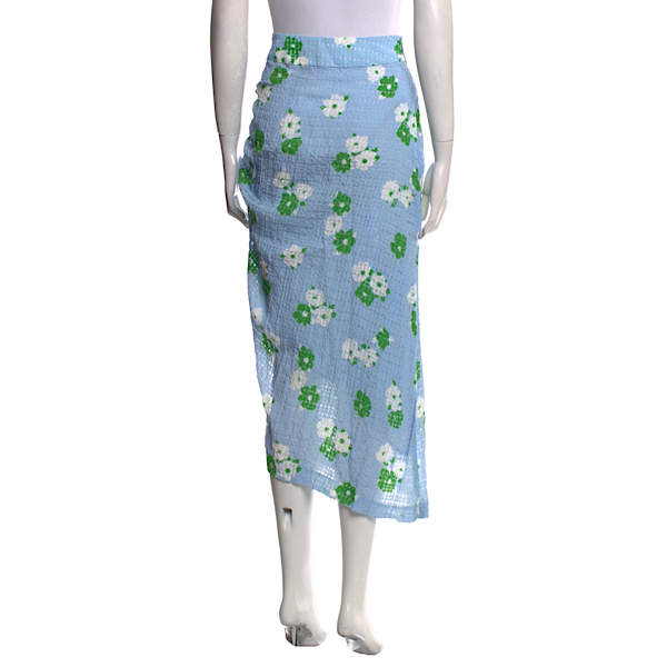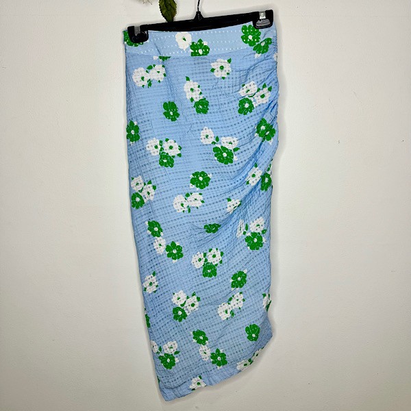 Fresh and playful, this light blue skirt features a charming green and white floral print that brings a bright, summery feel to any outfit. Designed with a flattering high waist and subtle ruching through the front, it creates a softly contoured silhouette. The textured fabric adds dimension, while the asymmetrical hemline gives the skirt a modern, effortless finish. Hidden side zip closure.