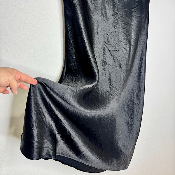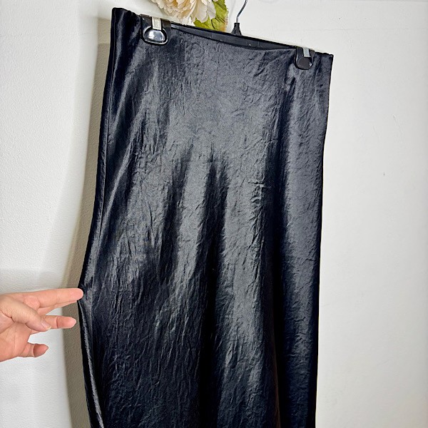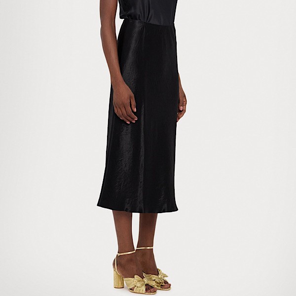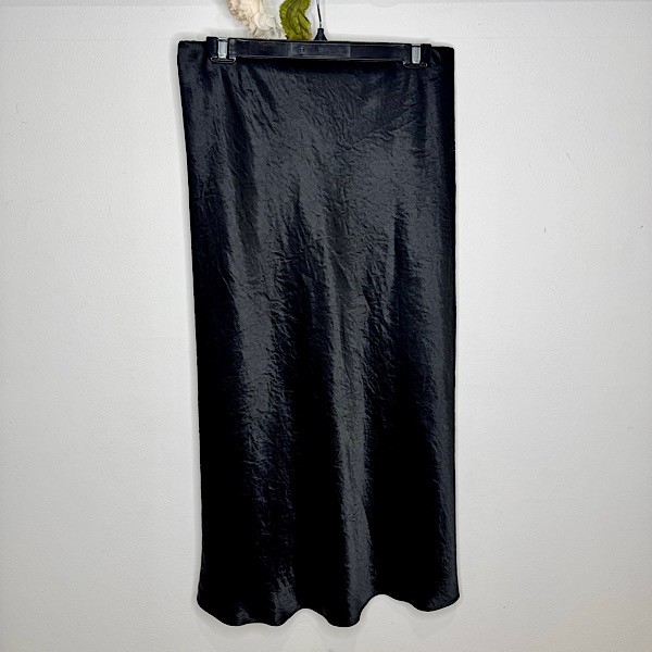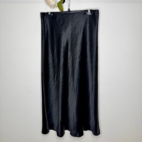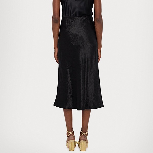 This is a pull-on midi skirt with an elasticized waist and a A-line silhouette. It's cut from drapey satin with a high sheen and vintage finish for a crinkled look and feel.
