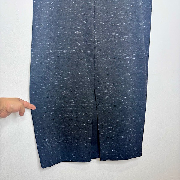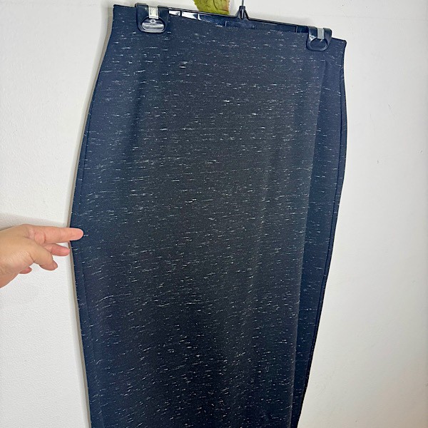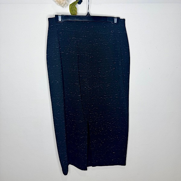 Polished and comfy in a cozy textural stretch wool blend. This is a knit pencil skirt with an elastic waistband with a slit at the back for ease of movement. Pull on wear. Midi length.