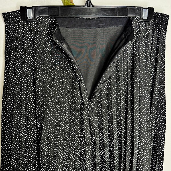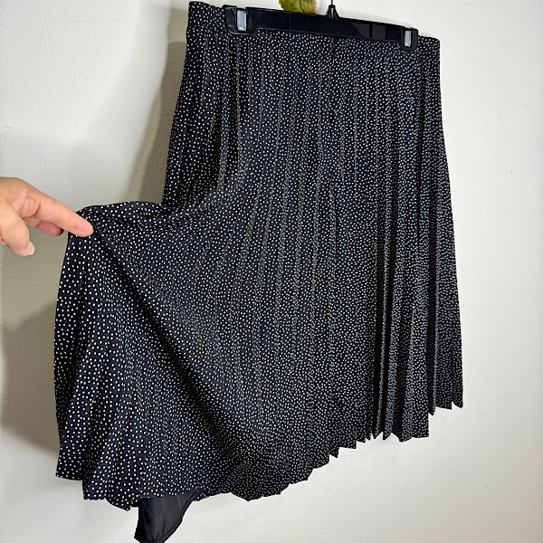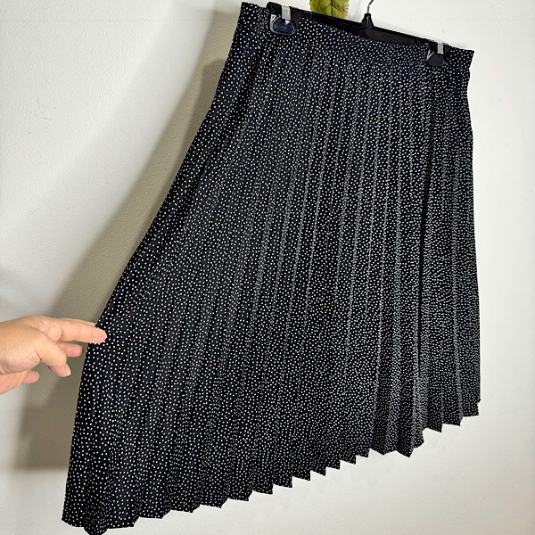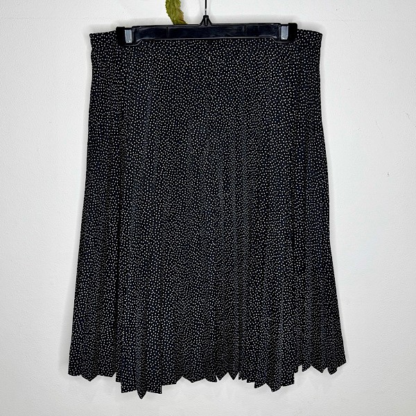 This chic pleated skirt features a subtle micro-dot pattern that adds just the right touch of texture and charm. Designed with a smooth waistband and soft, lightweight fabric, it drapes beautifully with every step. Back zip closure. Fully lined.