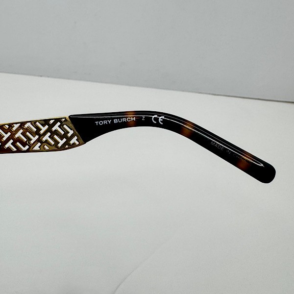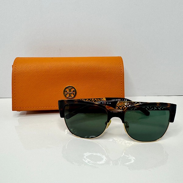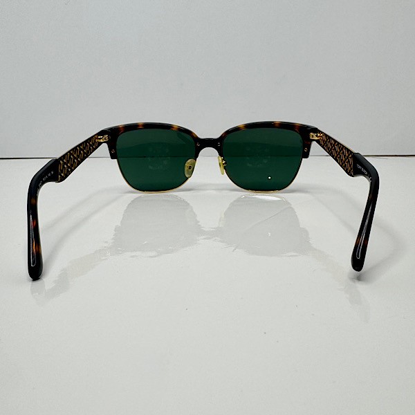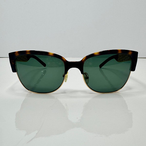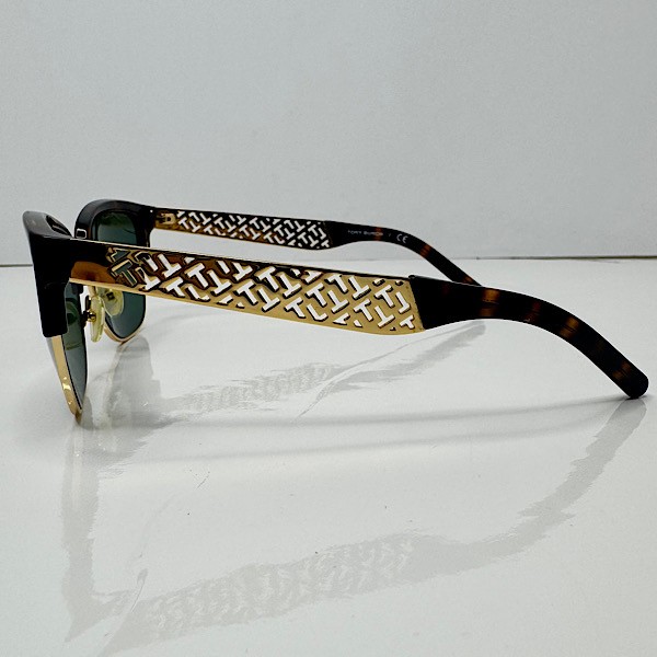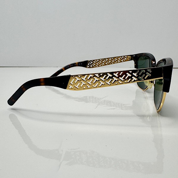 These stylish sunglasses have a tortoise and gold frame with dark grey lenses on a gold metal frame. The sunglasses have die-cut logo gold arms and tortoise tips.
